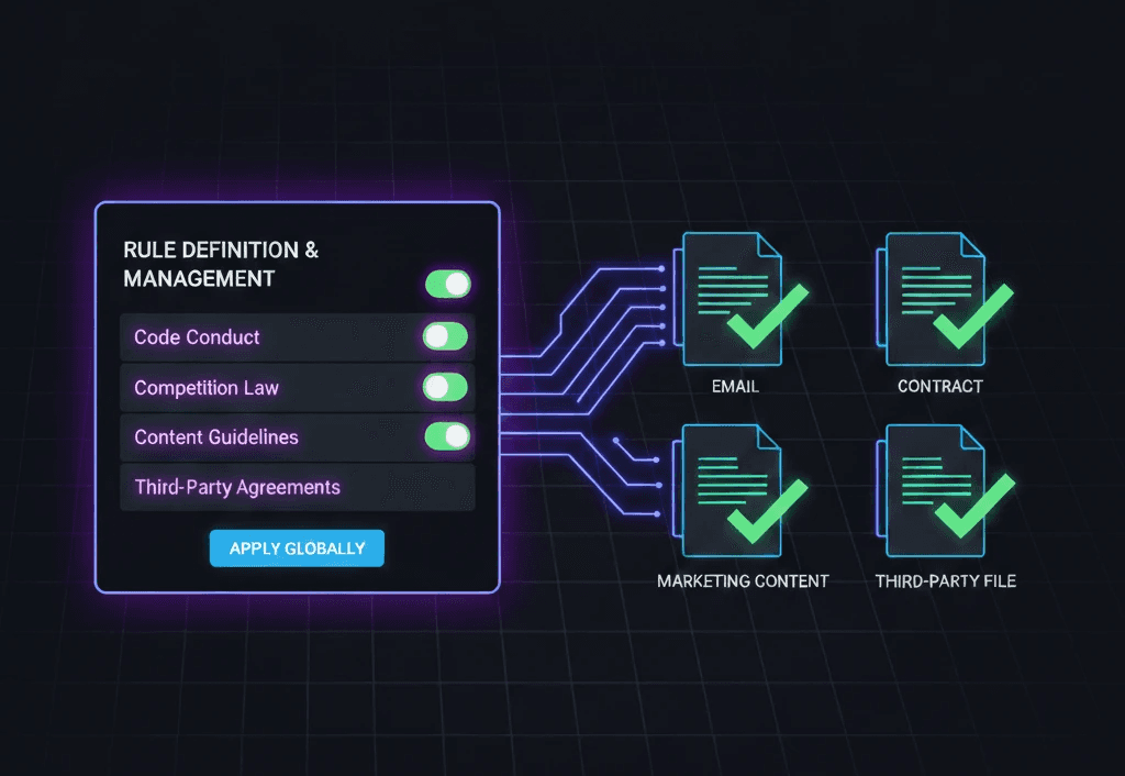 Set pre-defined or custom compliance rules once and apply them continuously across all content — from emails and agreements to project and third-party documents — with up to 80% more coverage.